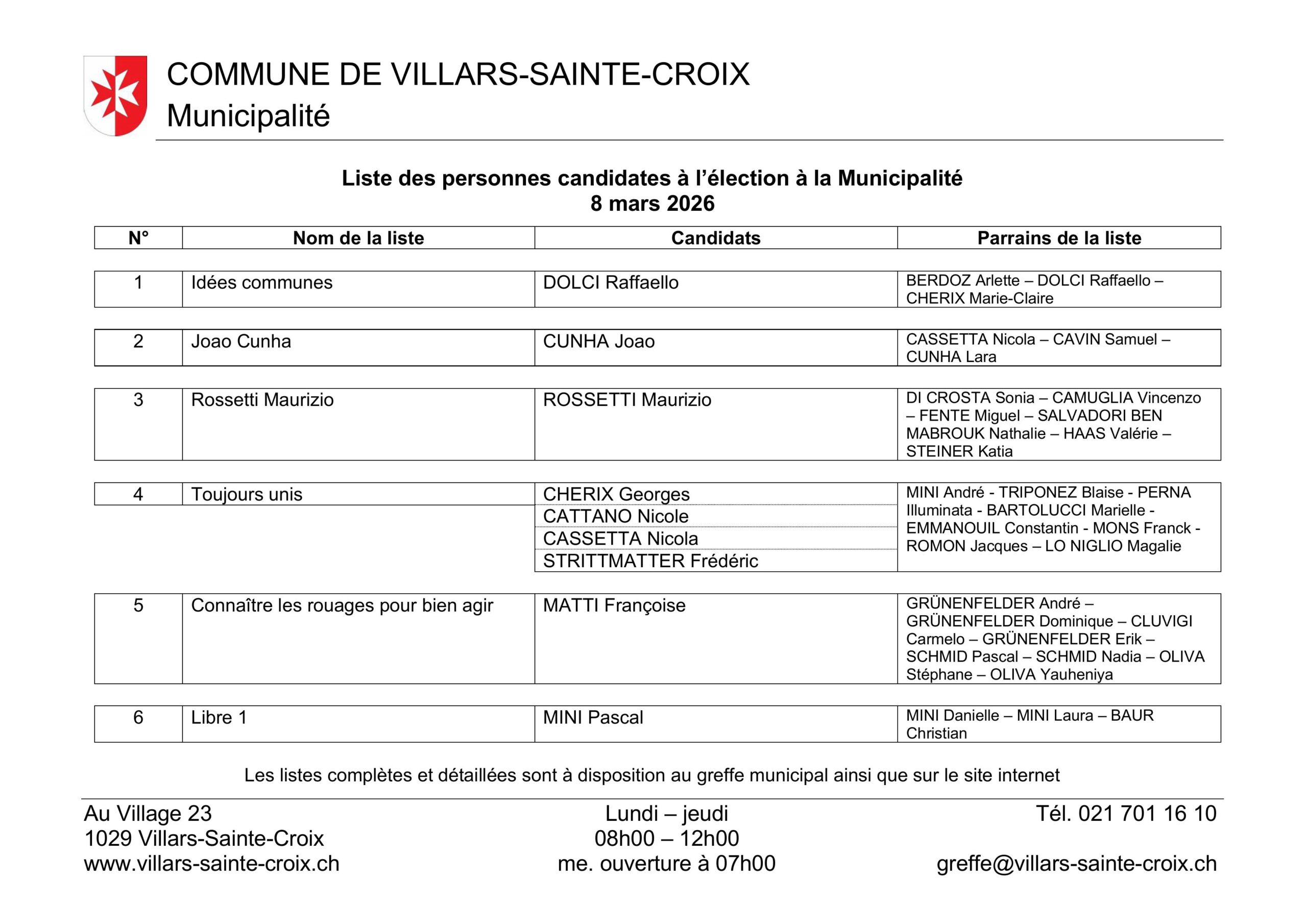 Liste des personnes candidates à l'élection à la Municipalité